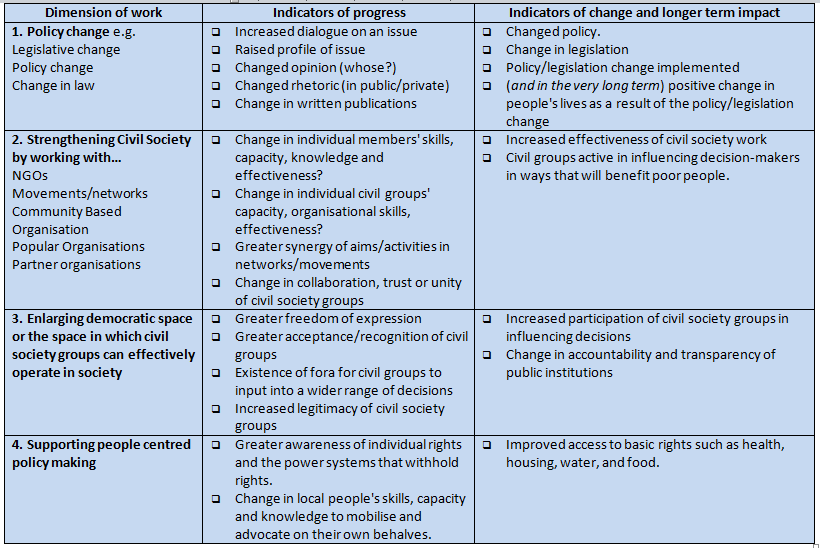 Jennifer Chapman and Amboka Wameyo (2001). Monitoring and Evaluating Advocacy: A Scoping Study, ActionAid